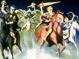3. CABALLO NEGRO: Escases. 6:5-6 “Cuando abrió el tercer sello, oí al tercer ser viviente, que decía: Ven y mira. Y miré, y he aquí un caballo negro; y el que lo montaba tenía una balanza en la mano. 6:6 Y oí una voz de en medio de los cuatro seres vivientes, que decía: Dos libras de trigo por un denario, y seis libras de cebada por un denario; pero no dañes el aceite ni el vino.” La escasez y la injusticia pueden llevar a una persona o a un pueblo al borde del abismo. |